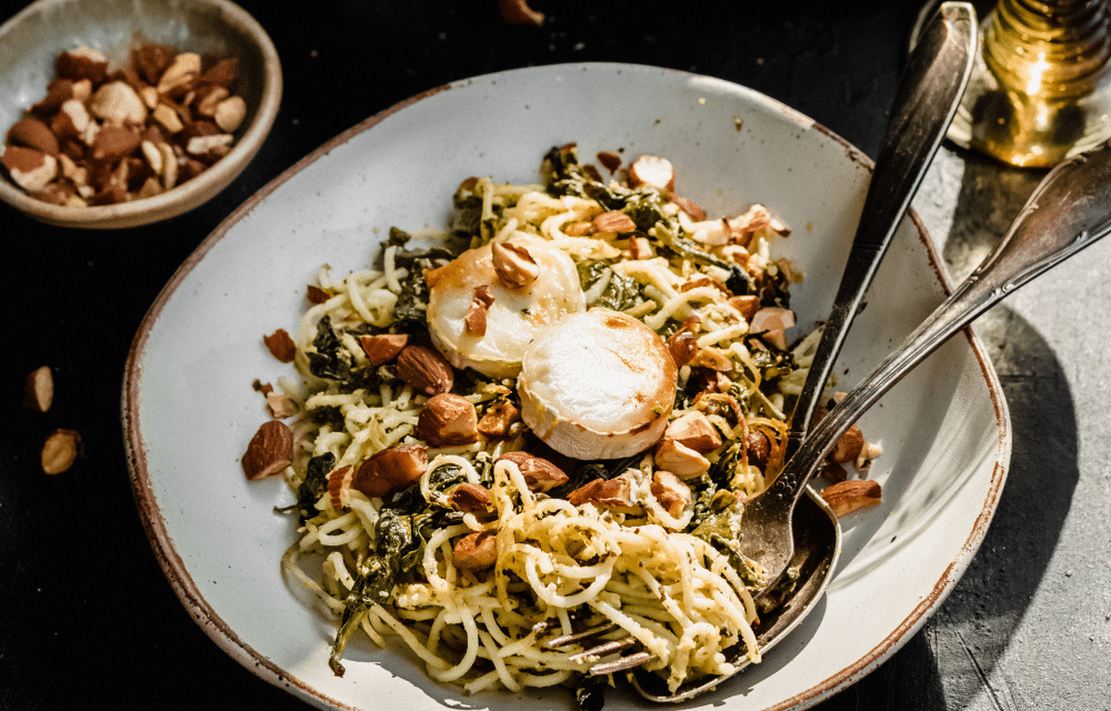 Gesponsord – Maza Esfenaj is een heerlijke spread gemaakt van spinazie, kikkererwten en amandelen voor op brood of bij de borrel. Dat esfenaj ook lekker is met spaghetti bewijzen we met deze one-pot esfenaj pasta. De verse spinazie en amandelen laten de smaken uit de esfenaj extra naar voren komen en de geitenkaas maakt de pasta helemaal af.