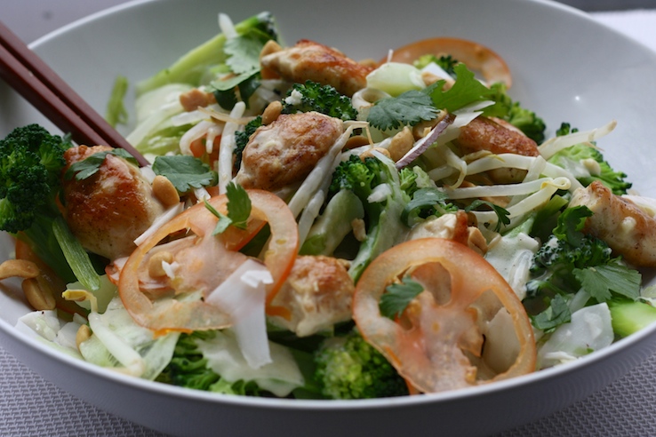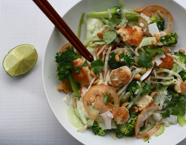 Deze lauwwarme pad thai salade zit bomvol knapperige groenten met daarbij blokjes kip, een lauwwarme kokos-limoen dressing, versgemalen kokos en natuurlijk gehakte pinda’s. Maar je kan deze salade compleet naar je eigen smaak invullen! Wok bijvoorbeeld blokjes tofoe als je liever een vega variant hebt en gebruik vooral de restjes groenten die nog in je groentela liggen. Paprika, geraspte courgette, wortel, ook allemaal lekker in een Pad thai salade!