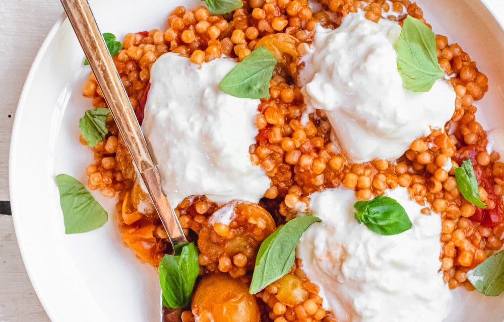 Hoe maak je deze parelcouscous met burrata? Heel simpel! Fruit knoflook en parelcouscous kort aan in wat olie. Voeg tomatenpuree en groentebouillon toe en laat zachtjes koken. Roer de cherrytomaatjes erdoor en laat het geheel pruttelen tot de couscous gaar is. Verdeel over de borden en top op af met een heerlijke bol burrata. Even opensnijden zodat die romige binnenkant eruit loopt en… aanvallen maar! Enne, ook lekker: voeg een handje verse basilicum toe.