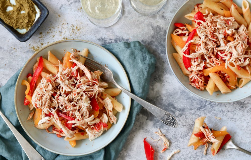Zin in makkelijk comfort food met maar 5 ingrediënten dat ook nog eens binnen 30 minuten op tafel staat? Zie hier de 5-or-less van vandaag: een Mexicaanse penne met paprika, tomaat en komijn. En dan ook nog heerlijke pulled chicken on top!