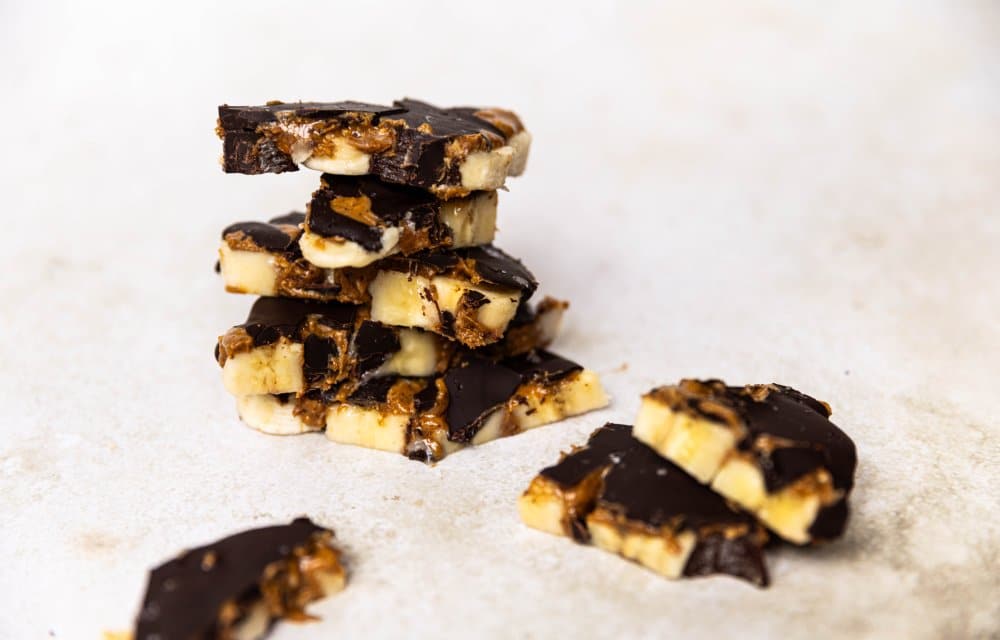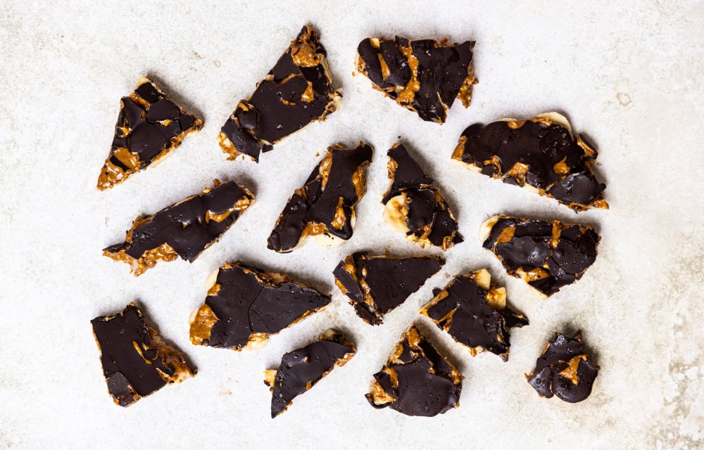 Hoe je het maakt dan? Je legt wat antislip bakpapier (dat hebben ze gewoon bij de supermarkt) op een plank of plaat en belegt deze met plakjes banaan. Daarna een laag pindakaas, wat gesmolten chocolade, een snufje zout… en hoppa,. that’s it! De vriezer doet verder het werk voor je. Na een uurtje is de pindakaassnack klaar, en breek je ‘m in stukken. Zo’n snack wordt ook wel een ‘bark’ genoemd, trouwens!