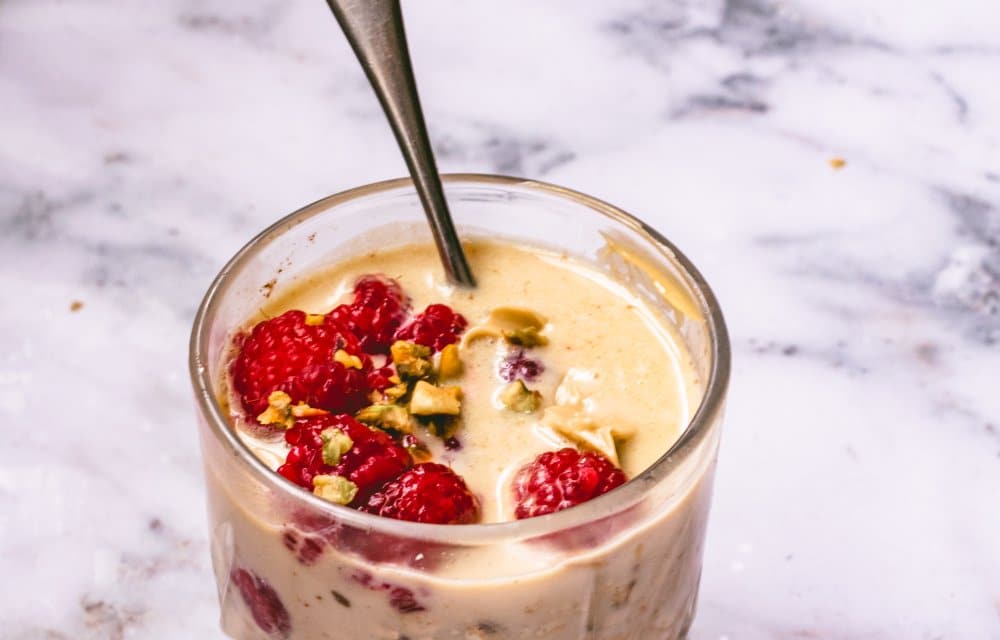 En de bereiding? Die is dus echt peanuts. Je doet gewoon de havermout, amandelmelk, pistachepasta, honing en een snuf kaneel in een potje of kommetje, roeren maar en hop, de koelkast in. Meer is het niet. Terwijl jij lekker ligt te slapen, neemt de havermout alle smaken op en wordt het heerlijk romig. De volgende ochtend hoef je alleen nog even te roeren, misschien een extra scheutje melk erbij en daarna maak je het af met knapperige pistachenootjes en frisse frambozen. Easy does it.