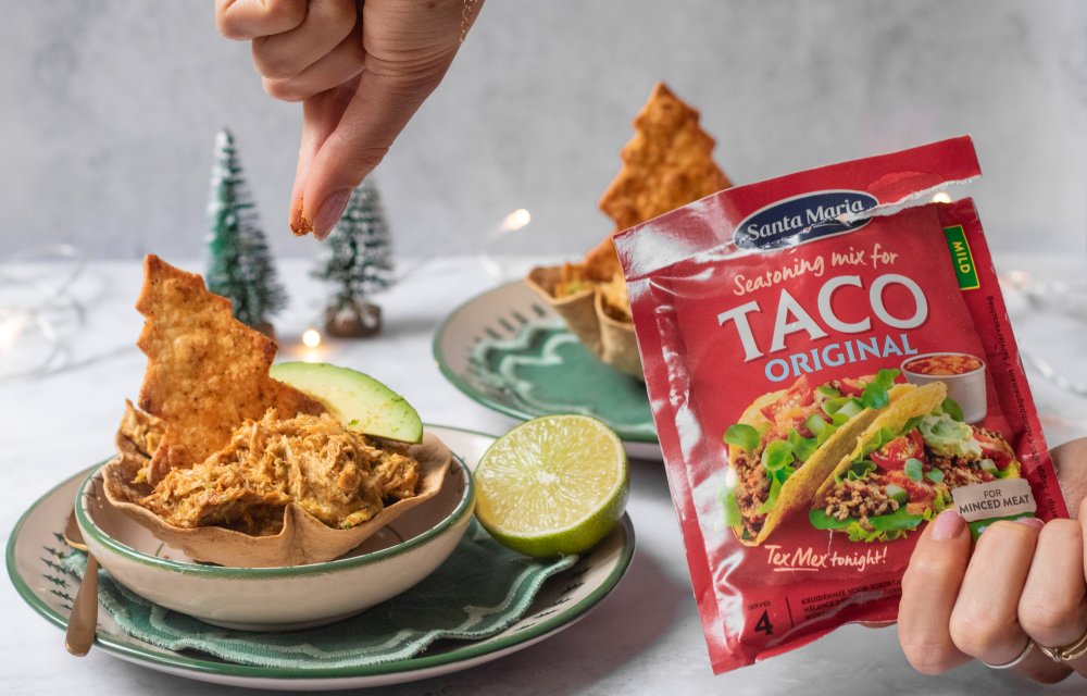 Dit is ook nog eens écht simpel recept, je hebt maar 6 ingrediënten nodig. Ook leuk voor kids om mee te helpen! Terwijl de kip zachtjes gaart, steek je vrolijke kerstvormpjes uit de wraps en maak je de tortillabakjes. Een laagje Santa Maria taco kruidenmix erop, even de oven in en klaar zijn je krokante bakjes en sterren. De pulled chicken wordt onweerstaanbaar smeuïg met mayonaise, avocado en wat limoen. Voor de finishing touch gebruik je de tweede avocado in reepjes en wat extra limoenrasp als garnering. Deze pulled chicken cocktail is ideaal om je kerstdiner mee te starten: licht, luchtig en een beetje speels, precies wat je nodig hebt om de sfeer erin te brengen.