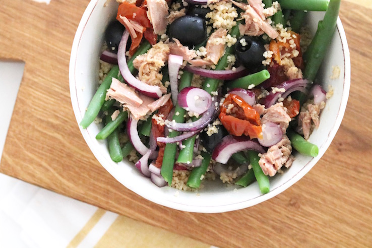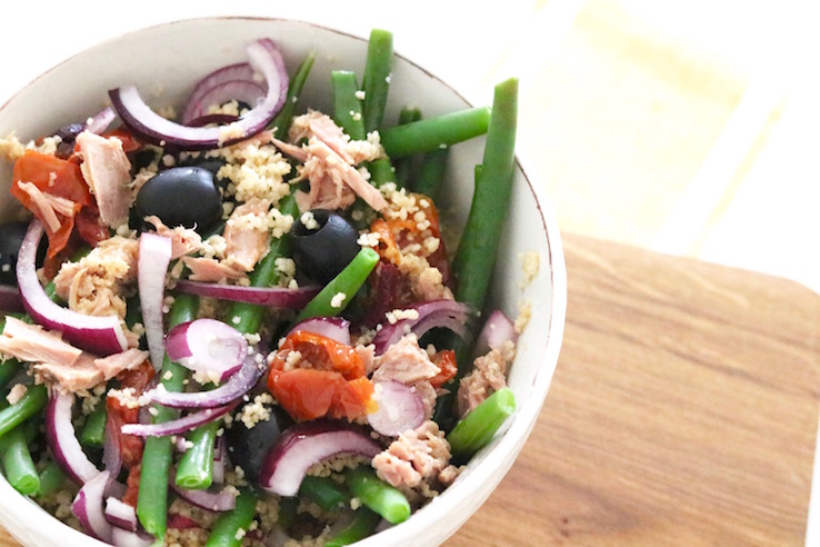 Oké, oké toegegeven, de ingrediënten van deze couscoussalade komen niet precies overeen met de klassieke salade niçoise (zo laat ik het ei eruit, ik krijg het niet meer weg sinds mijn zwangerschap…), maar het komt wel in de buurt! Daarom noem ik het couscous niçoise.