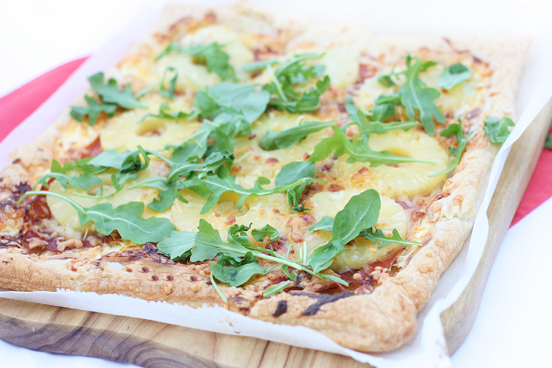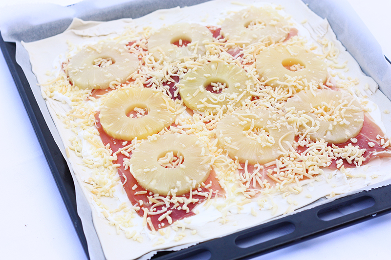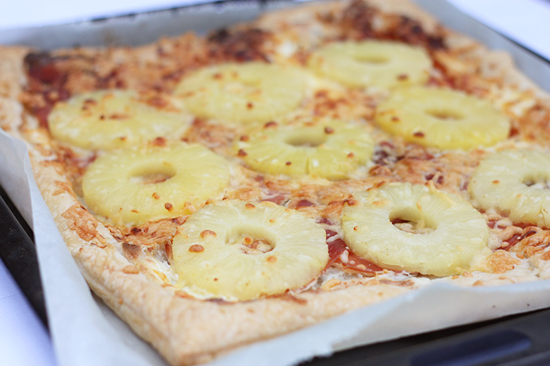 Als je in Italië vraagt om een pizza Hawaii, krijg je nog net geen tik op de vingers. Het is namelijk helemaal geen Italiaans product, maar Canadees. Oh well, het neemt niet weg dat de combinatie ananas en ham écht heel erg lekker is. En zo heerlijk als -ie is op een pizza, zo heerlijk is -ie ook op een plaattaart.