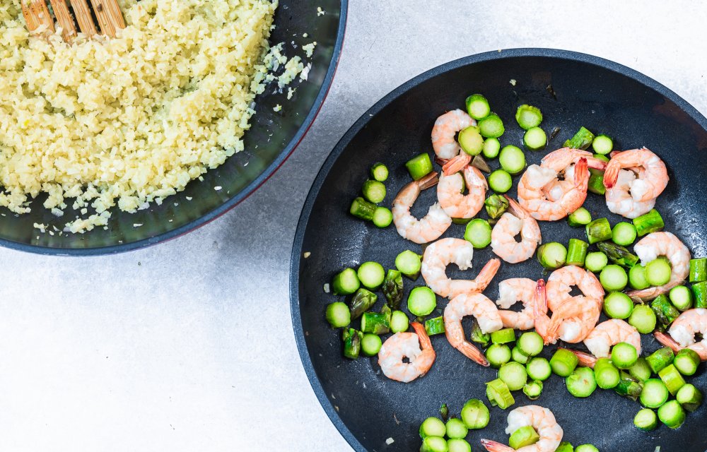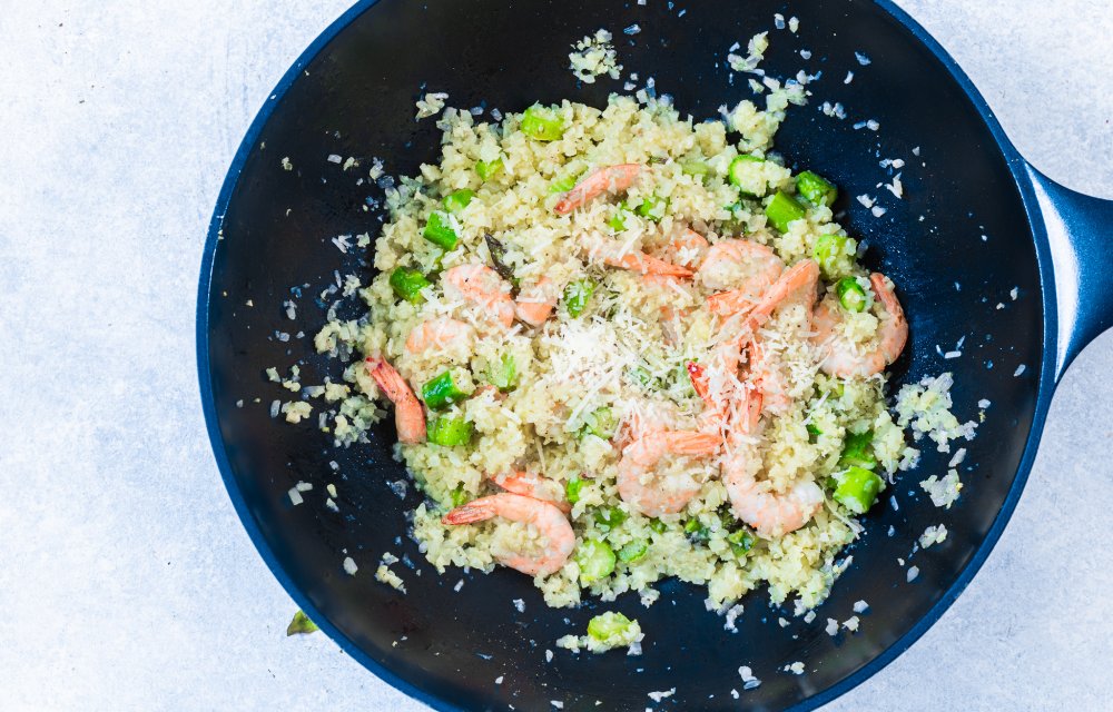 Risotto van bloemkoolrijst met garnalen