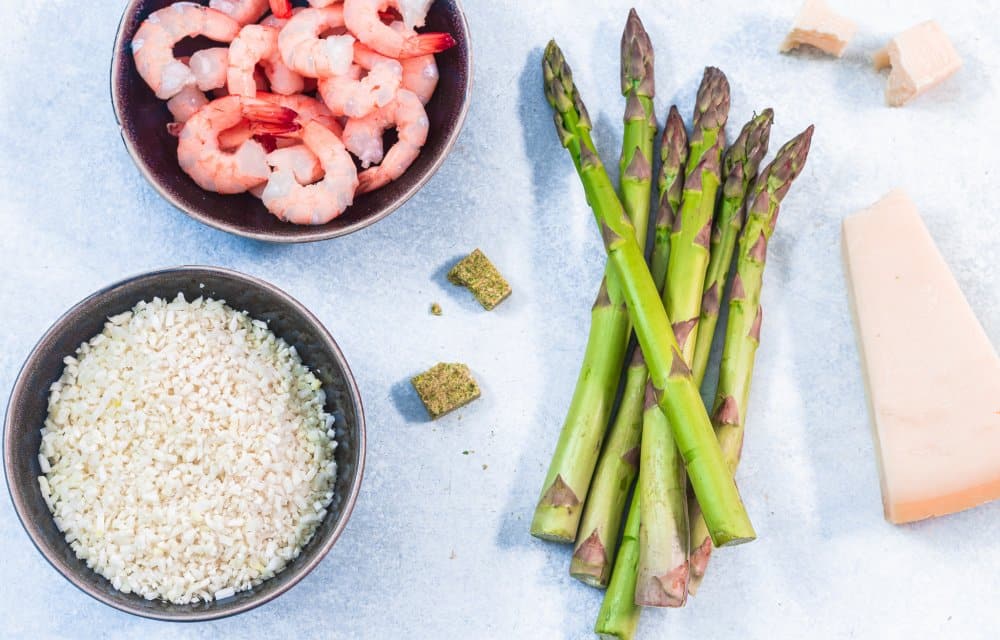 Deze risotto van bloemkoolrijst met garnalen en groene asperges is perfect voor wanneer je zin hebt in een extra portie groente. Omdat we geen échte risotto gebruiken, maar bloemkoolrijst, is deze 5 or less binnen 15 minuten klaar. Gezond en snel was nog nooit zo lekker!