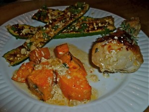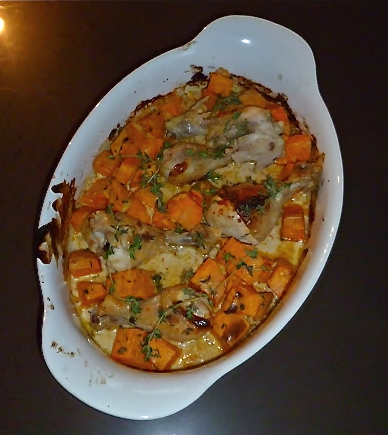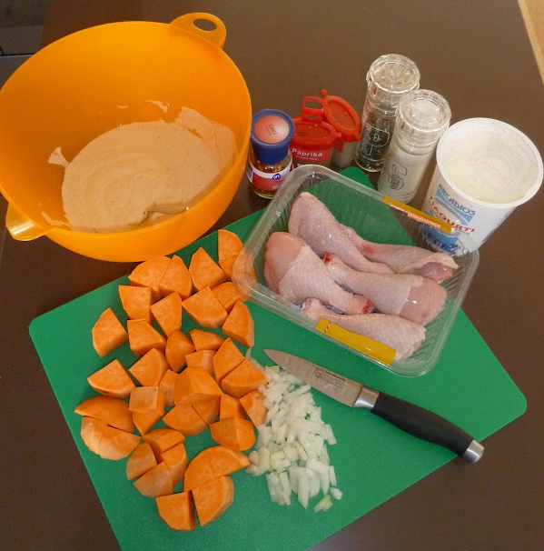Inmiddels is wel bekend wie Mark en Martine zijn toch? Met dit setje heb ik regelmatig eetdates. Mark en ik duiken dan de keuken in, terwijl Martine haar zoon Finn de borst geeft of de tijd van het koken bij houdt :-). Dit gerecht maakte Mark op mijn verzoek. Hij serveerde er een Indiase courgette-salade bij en hierdoor werd ook deze eetdate wederom een giga succes. Tijd dus om dit heerlijke maaltje met jullie te delen. Vandaag de kip en zoete aardappel schotel, het recept voor de salade volgt later deze week!