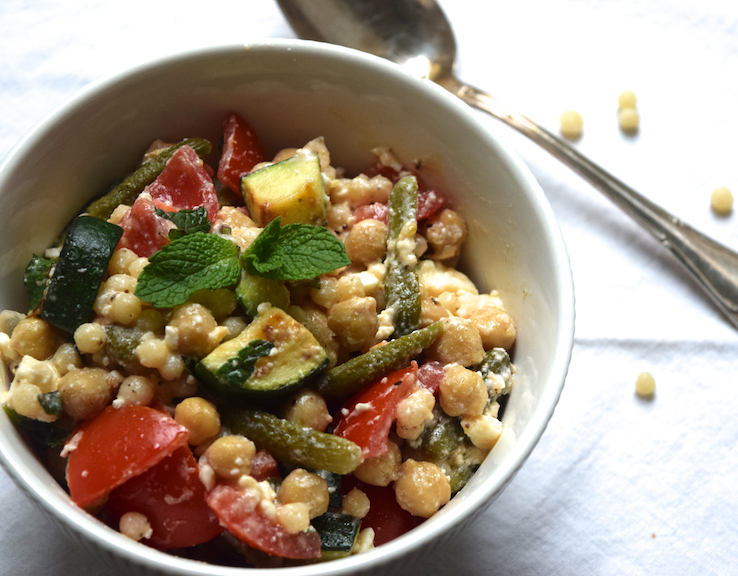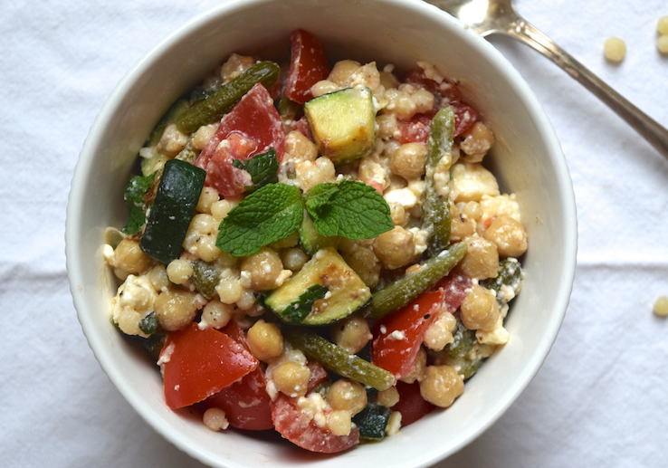 Of salade… het is wel echt een volwaardige maaltijd. Je eet dit gerecht met parelcouscous lauwwarm. Komt -ie!