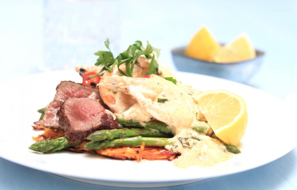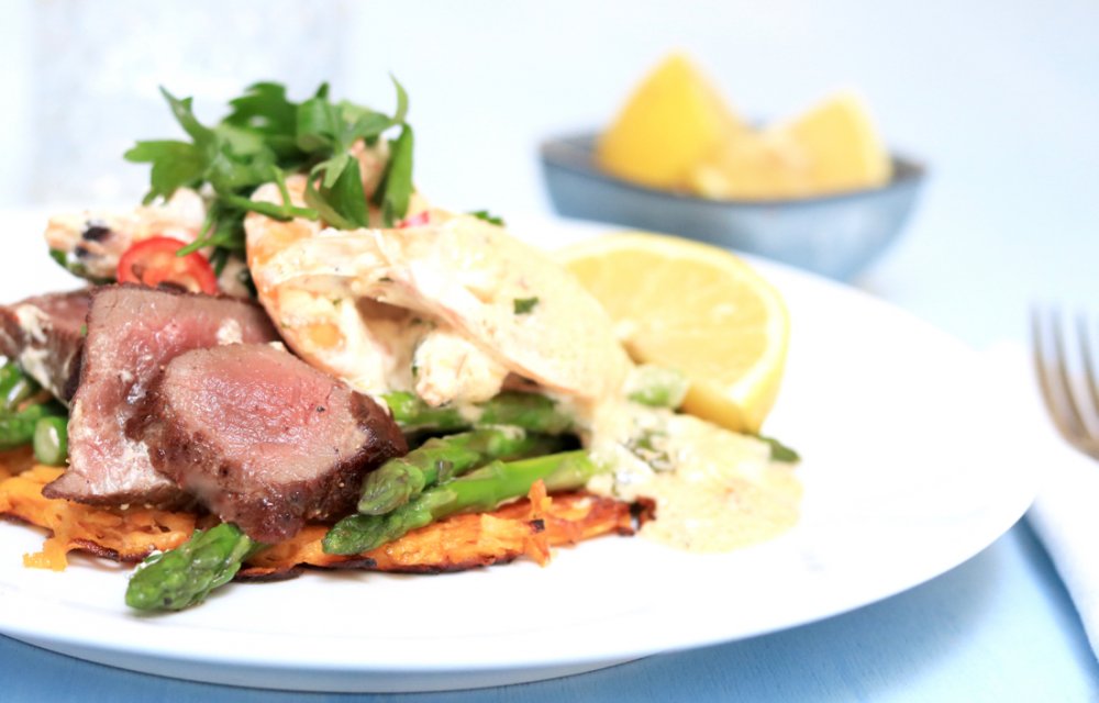 Gesponsord – Hoe lang doe jij erover om een keuze te maken op een menukaart in een restaurant? Wij zijn daarin echt een dra-ma. Het leuke aan surf en turf vind ik, dat je dus niet hoeft te kiezen of je zin hebt in vlees of vis. Want, it’s got it all! Deze romige surf en turf hebben we gemaakt op een zoete aardappelrösti met grote gamba’s en hertenbiefstuk. Het kan je niet ontgaan zijn dat wij de afgelopen zomer al flink wat met hertenvlees aan het maken zijn. Waarom? Omdat dit Nieuw-Zeelands hert zo’n goed stukje vlees is met een pure smaak, daar word je gewoon blij van!