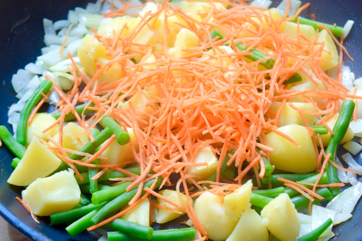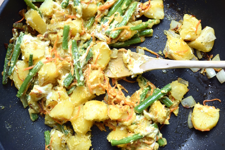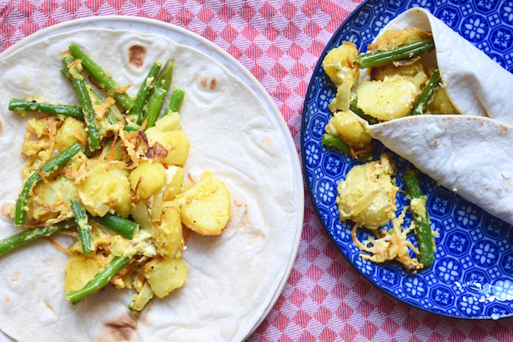 Toen ik nog in Leiden woonde haalde ik wel eens roti. Een soort pannenkoek gevuld met aardappelen en groenten zoals kouseband, ik ken het uit de Surinaamse keuken. Ineens schoot me dat te binnen en bedacht ik me hoelang ik dat al niet had gegeten. Schande! Ik ga snel op zoek naar een goede rotiboer 😉 in Amsterdam (tips?), maar ik probeerde ook een heerlijke simpele versie thuis uit. Zo, wat is dit lekker!