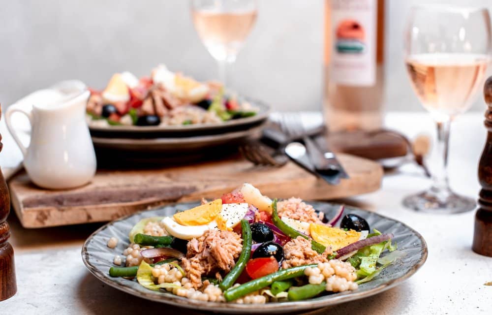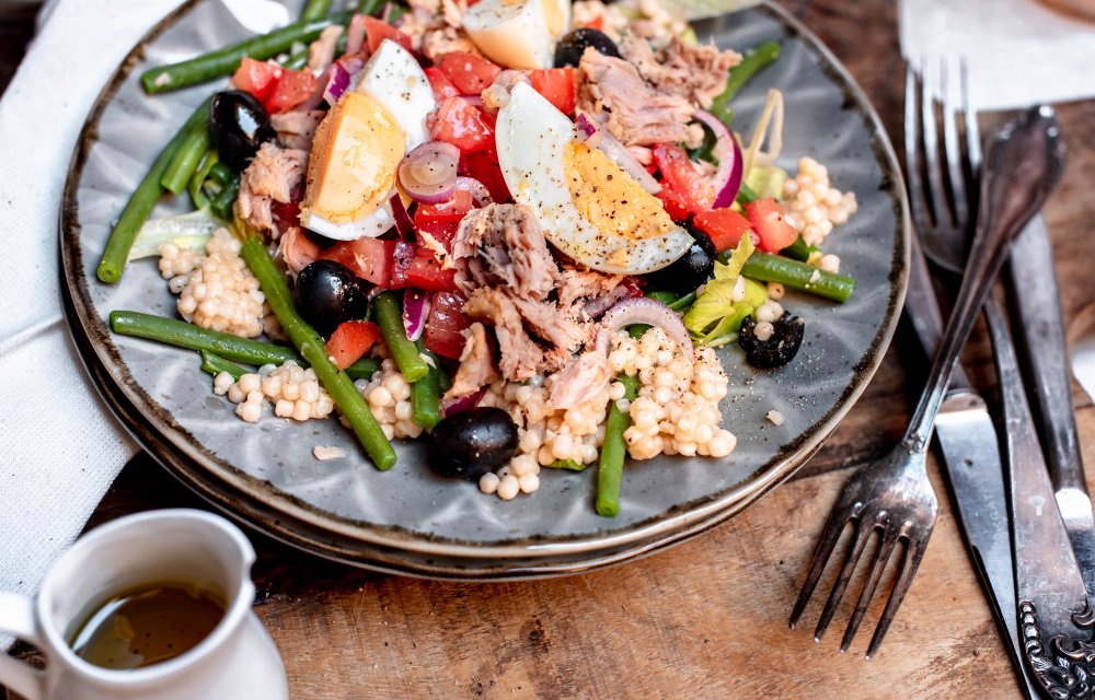 Deze salade niçoise met parelcouscous is precies wat je nodig hebt op een zonnige dag. Alhoewel het een klassiek gerecht is, vernoemd naar de Franse stad Nice, bestaat er geen officieel recept van. Men eet het overal net iets anders. Maar, tonijn en ei zullen nooit ontbreken. Die ingrediënten kun je dus ook in onze variant verwachten. Wij serveren ‘m verder met haricots verts, zwarte olijven en een heerlijke dressing van knoflook, honing en azijn.
