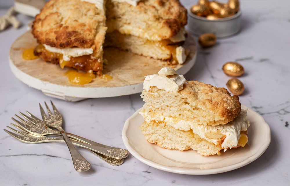 Deze sconetaart bestaat uit twee dikke, goudbruine sconeschijven die je bakt zoals je scones zou bakken, maar dan op XXL-formaat. Een beetje lemoncurd ertussen, clotted cream erop en je bent klaar. Natuurlijk maak je het af met paaseitjes om helemaal in de paassferen te blijven. Het resultaat? Zacht en luchtig vanbinnen, een licht krokant randje aan de buitenkant, en een perfecte balans tussen zoet en fris. Zonder gedoe, mét resultaat – daar houden we van.