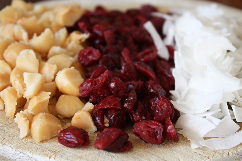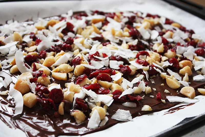 Het idee is dat je je eigen chocolade versiert met een topping. Ik heb voor mijn favo combi gekozen: cranberries en macadamia noten. Maar je kunt er bijvoorbeeld ook voor kiezen om andere noten toe te voegen, of een ander soort fruit. Hoe leuk?!