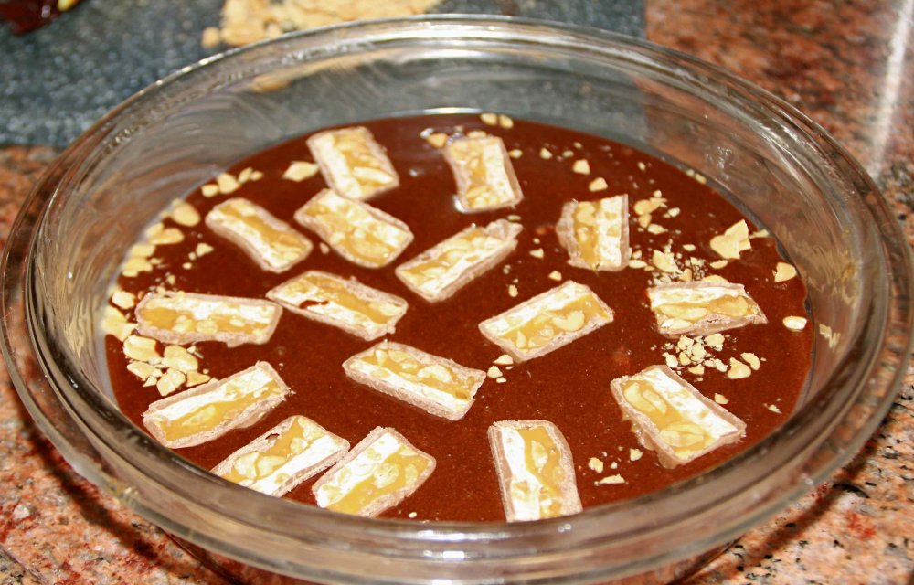 Deze taart is zo NIET bikini-proof, haha. But we don’t care, it’s Sinner Sunday!! En dit is zondigen op zijn best. Vorige week at ik in Rotterdam een home-made Snickers en dat was zo goddelijk, dat ik gelijk aan de Sinner dacht. Na een zoektocht naar recepten bleek dat het zelf maken van een Snickers een tijdrovende klus is, waarbij je maar liefst 4 lagen apart moet maken, wachten tot afkoeling, weer een laag maken etc. Leuk voor de experts onder ons, maar wij houden toch ook wel van snel! Na een brainstormsessie kwam ik op dit idee: een Snickerstaart. Met een originele Snickers en snel uit de oven, maar wel een home-made goddelijkheidje. Want dit experiment is echt een succesnummertje!