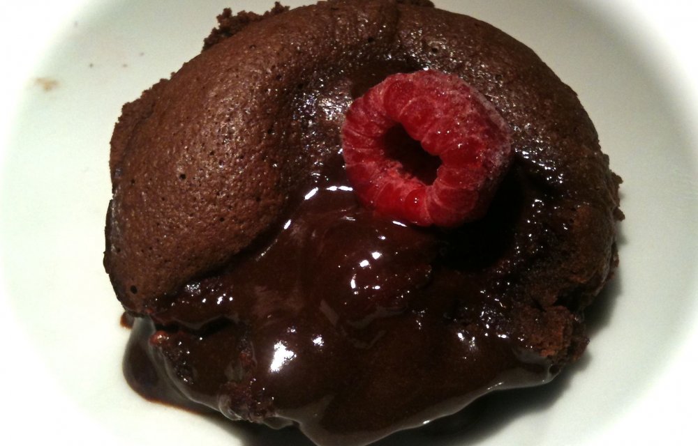 Warm chocoladecakeje met lopende chocolade en frambozen