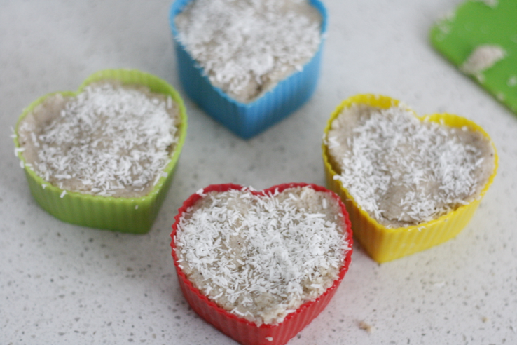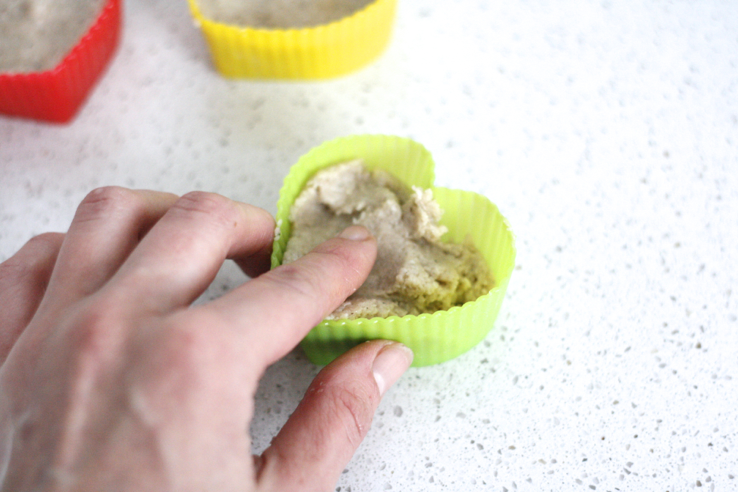Ik heb het mengsel in kleine siliconen cakevormpjes gedaan, maar een minimuffinvorm of een muffinvorm tot de helft vullen, moet ook werken!