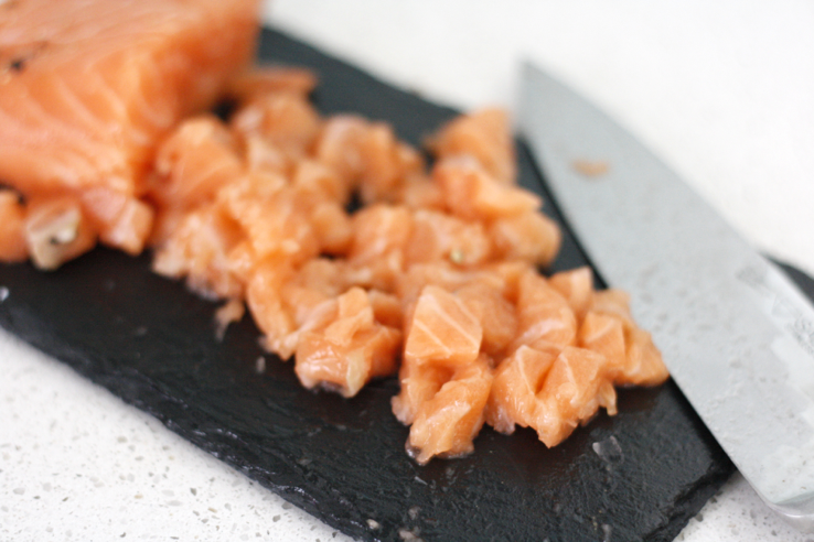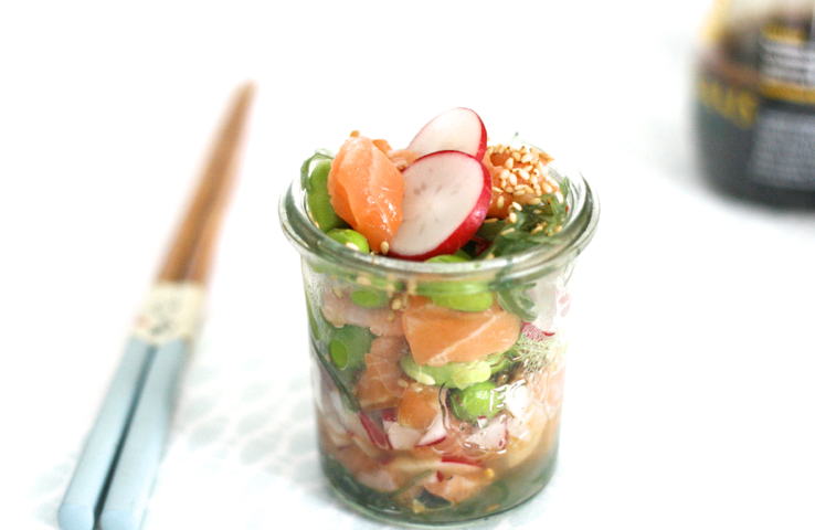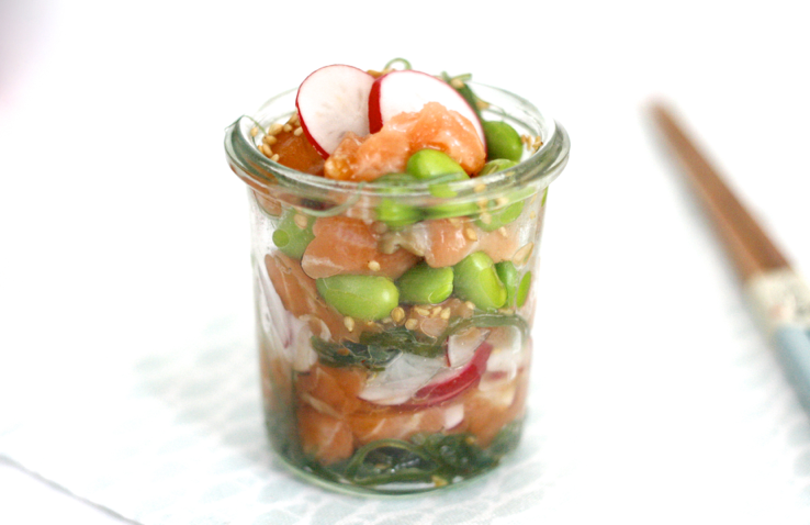 Een soortgelijk gerecht heeft mijn vriend Marcel afgelopen Kerst gemaakt. Doordat ik met de borstvoeding en de gebroken nachten ‘vrijstelling’ had, nam hij het menu op zich. Zo leuk! Uren zat hij te zoeken en te bladeren door kookboeken. M’n lekkere foodlover, haha. Als voorgerecht maakte hij een Oosterse zalmtartaar met gerookte zalm en edamameboontjes en wakame.