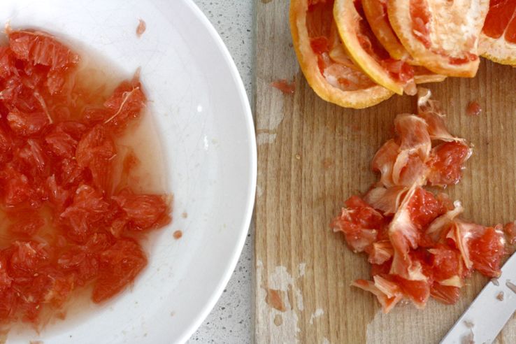 Eigenlijk eet ik niet heel vaak meer een grapefruit. Vroeger wel, toen kregen mijn zus en ik regelmatig allebei een halve, helemaal losgesneden zodat we alleen de hoekjes vruchtvlees eruit hoefden te lepelen. Heerlijk was dat! Dus toen ik ze zag liggen dacht ik tijd om daar een keer iets mee te doen!