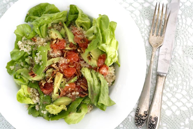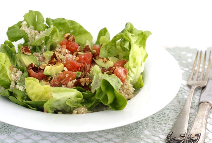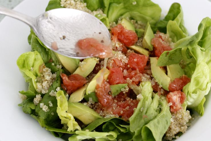 Het zoetzurige van de grapefruit is een heel lekkere combinatie met avocado. Doe daar wat quinoa bij (couscous of wat voor korreltjes dan ook, kan natuurlijk allemaal!), maak een dressing met de sap van de grapefruit en je hebt een heerlijke gezonde, skinny salade.
