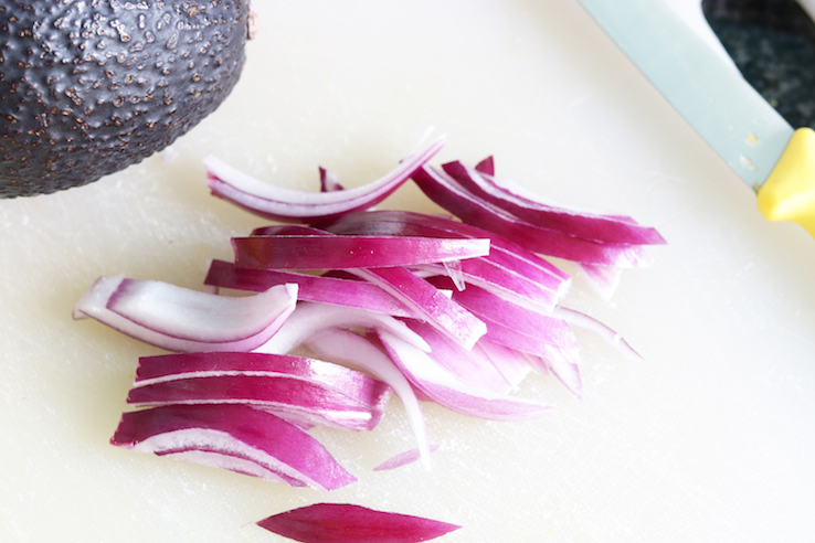Vandaag op het menu: gezonde slawraps met pulled chicken. Dat is kip die je kookt en vervolgens uit elkaar plukt totdat je een soort draadjes hebt. Mmm, zo lekker is dat. Meestal wordt het gemaakt met barbecuesaus als een variant op de pulled pork, maar wij combineren het vandaag met mango, avocado en rode ui.