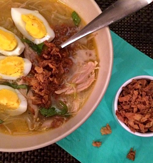 Een nadeel van zelfgemaakte kippensoep vind ik de bereidingstijd. Om echt een goede bouillon te maken, moet je geduld hebben. Toch is het me gelukt om in een half uurtje een heerlijke goedgevulde kippensoep te maken. Welliswaar met behulp van een biologisch bouillonblokje, maar goed je moet wat met een druk leven 🙂 Ik heb de soep een beetje een sotoh (oftewel de heel bekende Indische maaltijdsoep) draai gegeven, door het gebruik van gebakken uitjes en gekookte eitjes. Okay, let’s go!