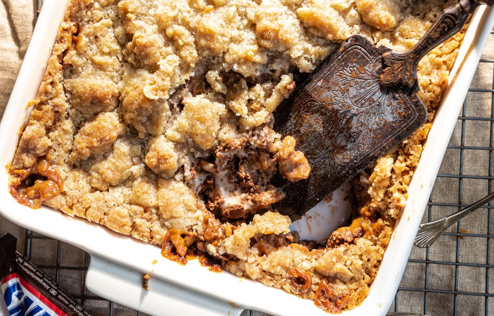 Ineens kreeg ik van de week een ingeving om in plaats van appel een candybar te nemen. En dan ben ik team Snickers, dus het werden, jawel: Snickers. En met succes. Halleluja, de gesmolten caramel en chocolade met de knapperige pinda’s die onder die nog warme crumblelaag vandaan komen zijn echt to die for. Try it! Veel makkelijker wordt het niet.
