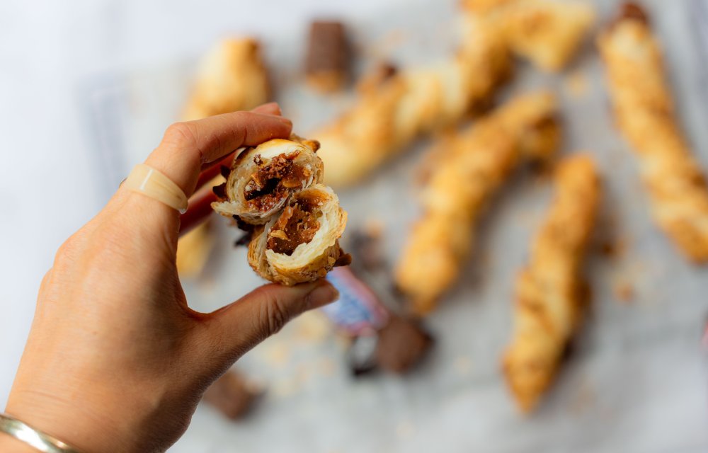 Benieuwd hoe je deze Snickers twisters maakt? Nou, dat is dus echt makkelijker dan je denkt. Je hebt maar één rol bladerdeeg en een paar Snickers repen nodig. Snijd het bladerdeeg in lange stroken, gooi de gehakte Snickers op een helft en vouw ze dicht. Druk de randen goed aan, geef ze een leuk twistje en smeer ze in met ei voor die perfecte gouden kleur. Dan komt het beste: een lading suiker en gehakte pinda’s voor die extra crunch. Na 20 minuten in de oven zijn ze goudbruin en gevuld met smeltende chocolade. Even laten afkoelen (als je dat geduld hebt) en genieten maar!