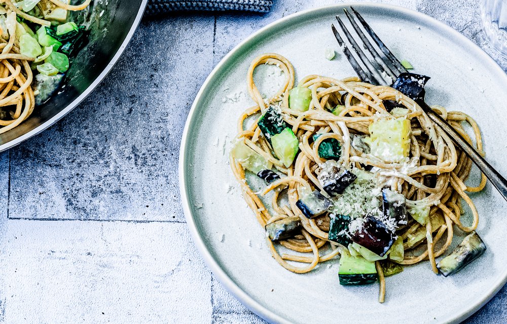 Van een simpel pastagerecht wordt iedereen blij! Deze snelle spaghetti bianca heeft het allemaal: een romige saus, courgette, aubergine en natuurlijk wat Parmezaanse kaas on top. Eet smakelijk!