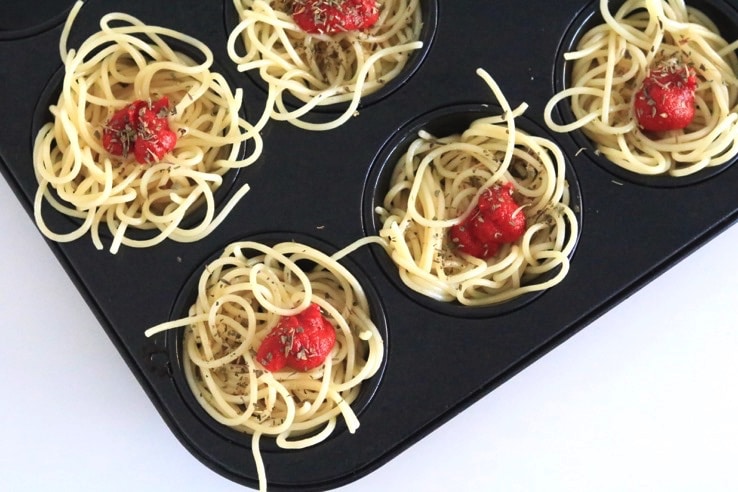 “De bovenkant van de spaghetticups worden lekker crispy. Is het té crispy voor jouw little one? Snijd dan wat van de bovenste spaghetti weg.”