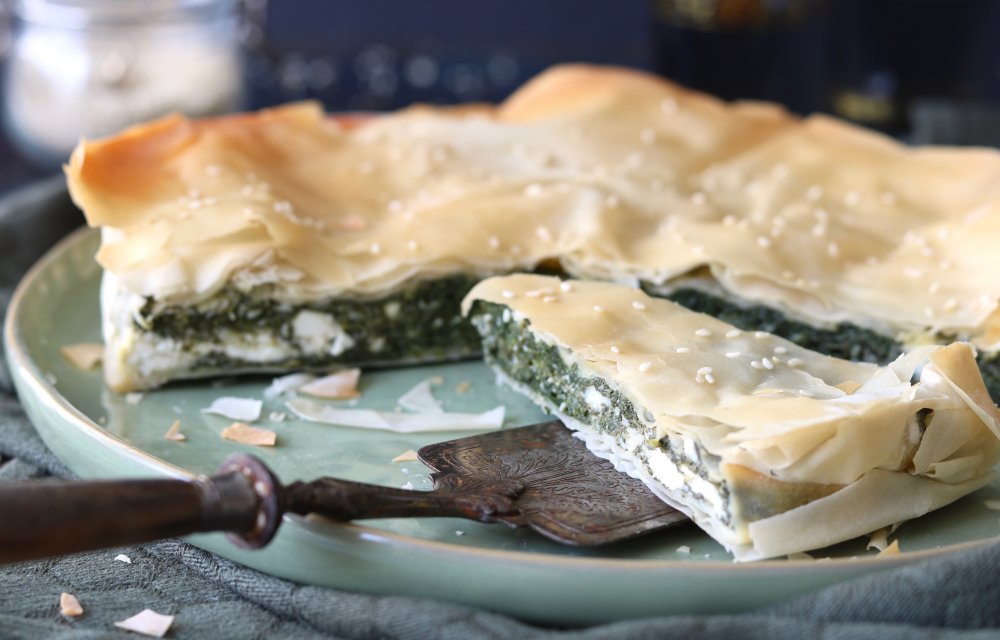 Haal je filodeeg uit de vriezer, laat rustig ontdooien en bak ondertussen die berg spinazie tot-ie helemaal is geslonken. Daarna goed laten uitlekken – en we bedoelen écht goed. Gooi alles samen met eieren, feta en sesam in een kom, mixen maar. Dan bouw je je taart: vellen deeg in een ingevette vorm draperen, vullen, dichtvouwen, bestrijken en in de oven. Easy peasy spanakopita.