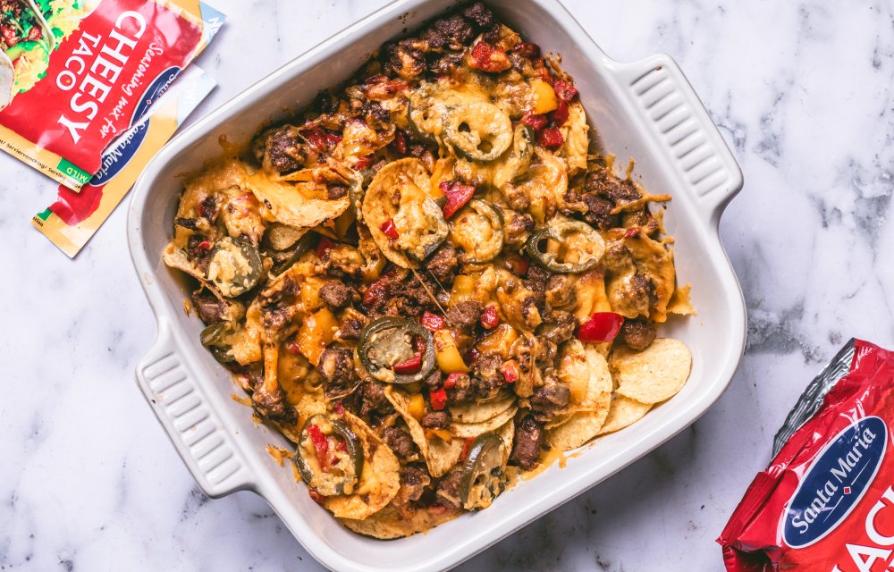 We maakten deze topper in samenwerking met Santa Maria, want als iemand weet hoe je nacho’s écht goed maakt, zijn zij het wel. Hun ronde tortilla chips zijn extra stevig, dus perfect om te beleggen (lees: niet één grote kruimelchaos na de eerste hap, halleluja) en met de cheesy taco kruidenmix en jalapeñoringetjes hoef je zelf niet meer te rommelen met losse kruiden.