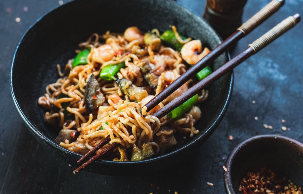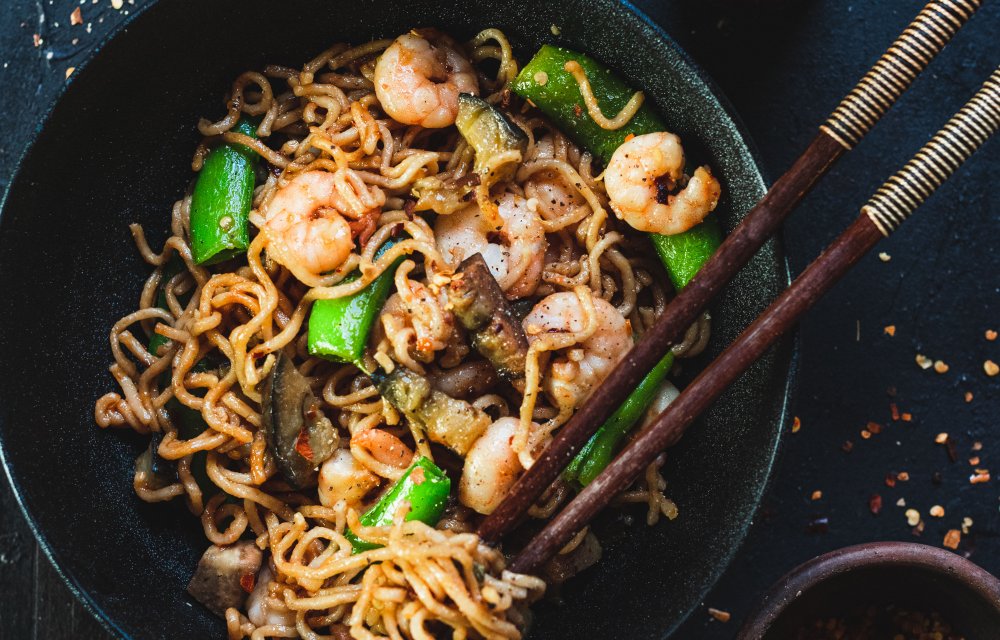 Spicy noedels met garnalen met 6 ingrediënten