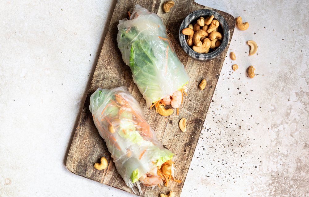 Het bereiden van de Springroll XXL is heel easy peasy. Begin met het weken van de mihoen in warm water en week vervolgens de springroll vellen kort in water totdat ze zacht en flexibel zijn. Leg de bladeren romaine op de 4 vellen, gevolgd door mihoen, garnalen, wortel en de geroosterde cashewnoten. Rol de 4 vellen samen strak op en voilà, je hebt de perfecte springroll XXL!