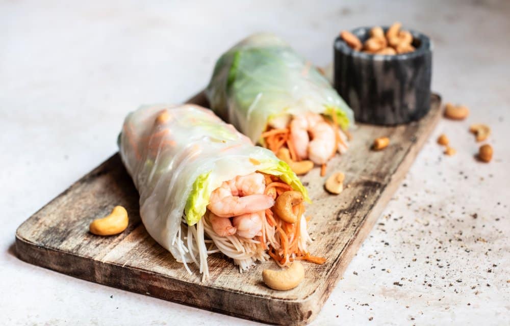 Deze springroll XXL is weer een heerlijke gezonde hap, binnen onze welbekende categorie ‘skinny six‘! Met maar 6 ingrediënten flans je dit kleurrijke maaltje in elkaar. Voor deze grotere versie van de klassieke springroll gebruik je 4 springroll vellen, sappige garnalen, knapperige wortel, romaine sla, mihoen en cashewnoten. Enne, binnen slechts 20 minuten staat ‘t al voor je neus! Ideaal na een lange werkdag of als je iets lekkers wilt meenemen naar het park.