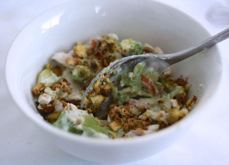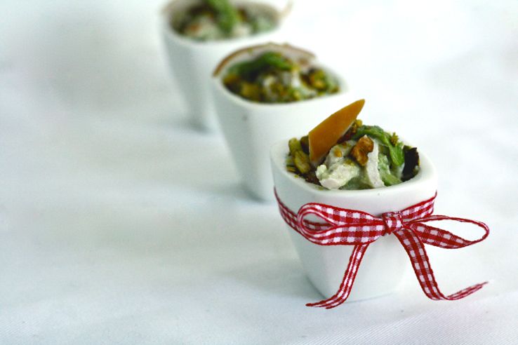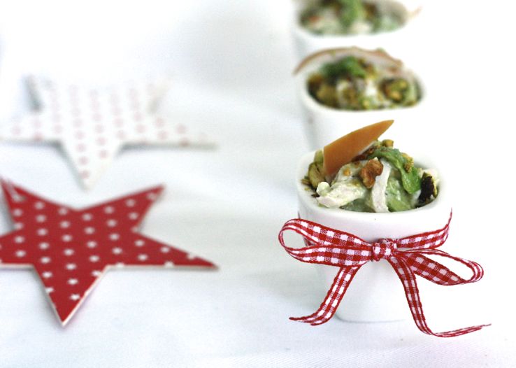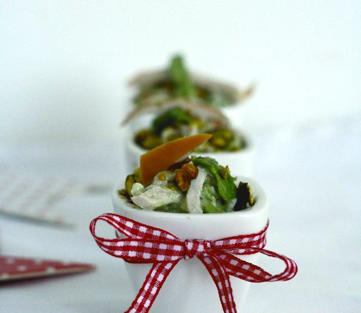 Deze amuse is geïnspireerd op een recept uit ons 5 or less-kookboek (heb je ‘m al? Zo niet klik hier). Ik heb op een lunchgerecht een amuse-variant gemaakt met onder andere gerookte kip, avocado, pistache en magere kwark. Romig, maar dus wel skinny door gebruik van de kwark. En jawel dit is een 5 or less-amuse, want je hebt toch geen zin om