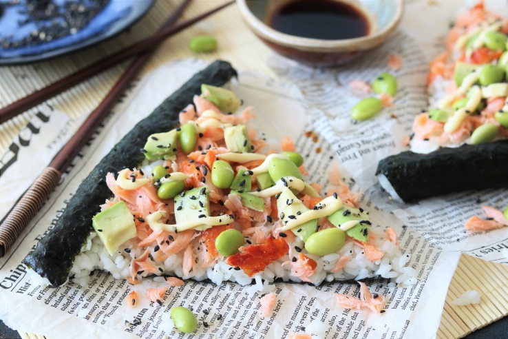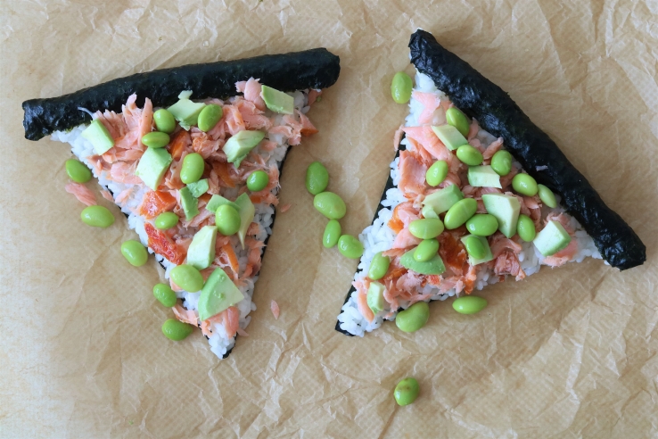 Sushi- én pizza lovers opgelet! Deze sushi-pizza met zalm, edamame en avocado is supermakkelijk om te maken (je hoeft namelijk niet te rollen). En je eet ‘m als een echte pizzapunt! Mmm…