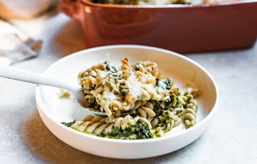 Met deze vega kip-pesto ovenschotel met 5 ingrediënten geven we een twist aan de klassieke pasta pesto. De pesto maken we met kaas, knoflook en spinazie en we maken de schotel af met vegetarische kipstukjes. En je hebt er maar een kwartier werk aan. Het andere kwartier mag de oven z’n best doen! Ja, deze pasta is een echte topper om te maken op een drukke dag!