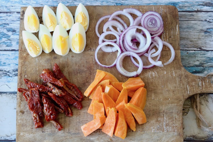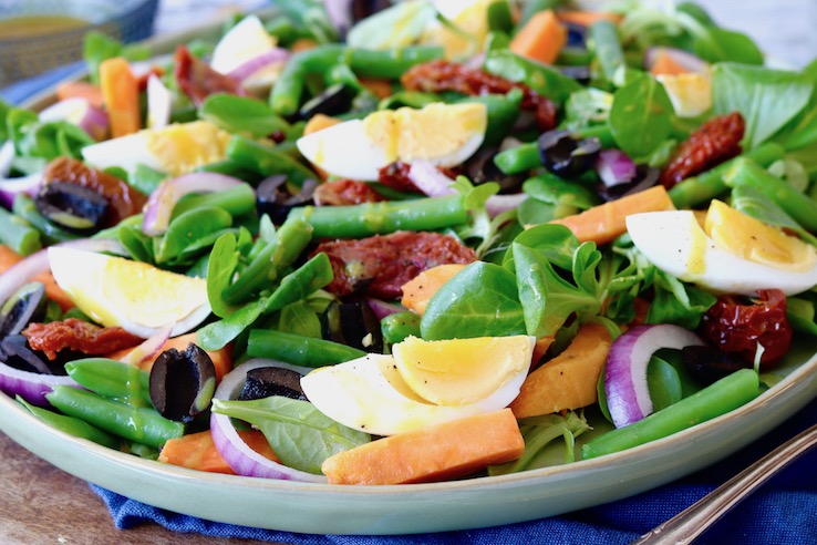 Klassieke salade Niçoise is van oorsprong een gerecht uit Nice, gevuld met ansjovis, tonijn, ei, haricots verts, olijven en rode ui. Ben je nu niet dol op vis? Dan kun je je vanaf vandaag te goed doen aan deze heerlijke vegetarische variant: geen tonijn, geen ansjovis, maar wél zoete aardappel (en alle andere goodies natuurlijk). Mmm… that’s more like it!
