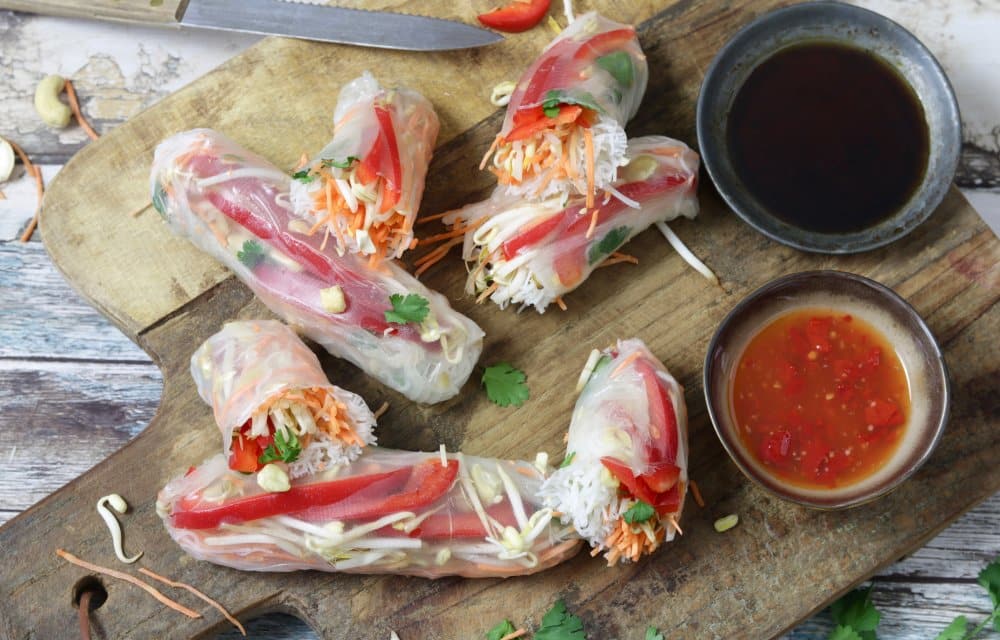 Deze vegetarische summer rolls zijn een zomerse variant van onze springrolls met pulled chicken. De summer rolls zijn gevuld met onder andere mihoen, wortel en taugé. De cashewnoten zorgen voor een bite. We maken dit gerecht af met een zelfgemaakt rode pepersausje.