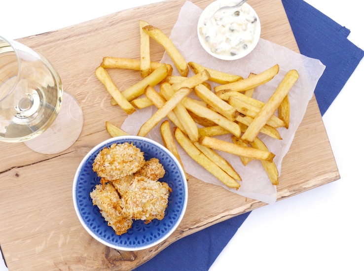 Om er een compleet gerecht van te maken serveren we deze visnuggets met knapperige frietjes en een heerlijke ravigotte mayonaise. Mmm, als dat niet genieten wordt!