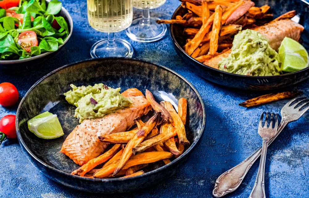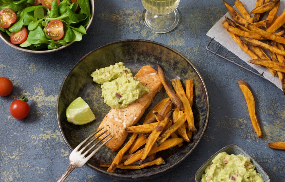 Zalm met guacamole en zoete aardappelfriet