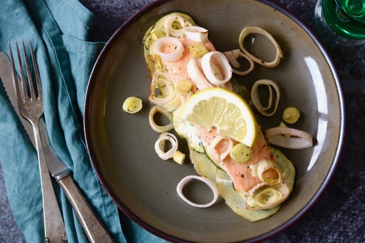 Zo fijn, je hebt voor dit recept geen pannen nodig. De oven doet al het werk en je hebt dus bijna geen afwas. Wat wil je nog meer? Doordat de aardappel en de courgette dun worden gesneden garen ze samen met je zalmfilet in de oven. De prei, knoflook en citroen die ook in het pakketje zitten, geven een heerlijke smaak aan de rest van dit skinny gerecht.