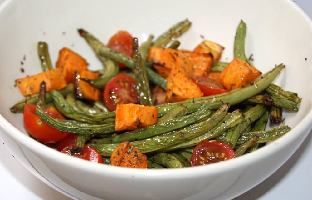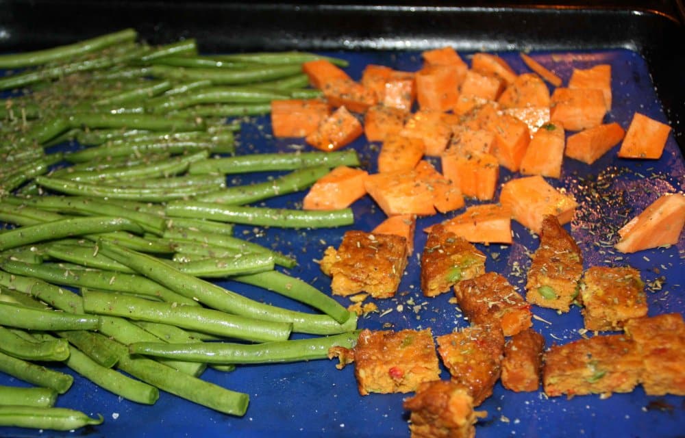 Geen pannen. Wat? Ja, echt! Voor dit recept heb je geen pannen nodig. Hoe lekker is dat? Dit gerecht maak ik vaak als ik laat en vermoeid thuis kom van werk. Boontjes doppen (je kan zelfs diepvries nemen, dat scheelt weer werk), aardappel schillen en een vega burger in stukjes snijden. Dat alles, hup op een bakplaat. Even douchen en eenmaal afgedroogd is je eten klaar. Super toch?