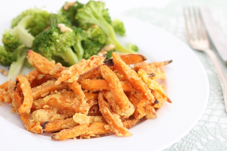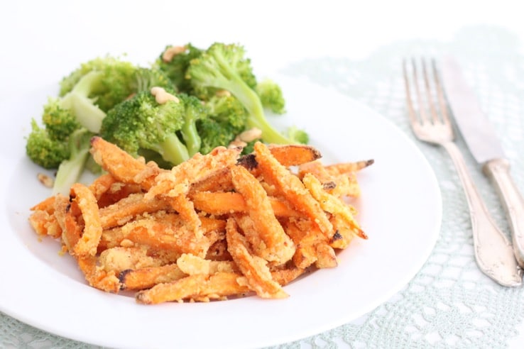 Echter wel een combi die heel erg aan te bevelen is. Want waren de crunchy zoete aardappelfrieten al lekker, met Parmezaan erover zijn ze onweerstaanbaar. En een good old broccoli en wat pijnboompitjes maakt dit dinertje helemaal af. Let’s go!