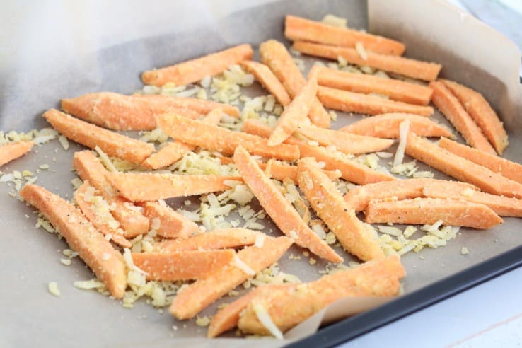 Oftewel cheesy parmesan sweet potato fries. Maar goed, we blijven gewoon lekker Hollands toch? Zoete aardappelfriet met kaas dus. En ik heb Parmezaanse kaas gebruikt, maar extra belegen kan ook hoor. Dit recept is weer zo’n heerlijk 5 or less-je voor doordeweeks. Best wel simpel, maar toch even een combi waar je niet zo snel aan denkt.