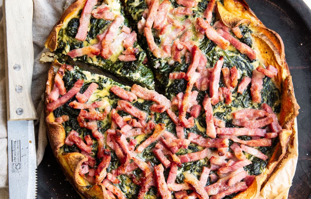 Kijk nou wat een mooierd, deze glutenvrije zoete aardappelquiche met spinazie. En dat met maar 5 ingrediënten, hè! We maken ‘m met spinazie, ei, kookroom, spekjes en helemaal fijn: de bodem is gemaakt van zoete aardappel. Dus als je even wat extra vitamines binnen wil krijgen, zit je wel snor met deze taart. En doordat -ie geen deeg bevat, is hij dus ook glutenvrij! Dus jep, het kan gewoon: een glutenvrije hartige taart op het menu zetten, zónder aan smaak in te leveren. Hieronder lees je hoe!