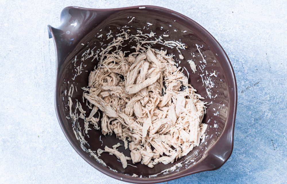 Zoete aardappelsalade met pulled chicken