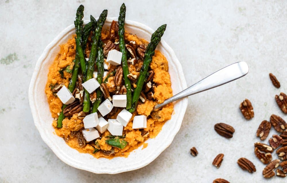 Het is je vast niet ontgaan dat we gek zijn op zoete aardappel. Je kan er ook zoveel kanten mee op. Pof ‘m in de oven, maak er frietjes van óf een heerlijke stamppot. Lekker dat -ie is! Hoe je ‘m maakt? We maken deze zoete aardappelstamppot met feta en groene asperges. De combi van zoete aardappel en feta is sowieso om te smullen. Voeg daar groene aspergetips, zongedroogde tomaten, pecannoten en spinazie aan toe en je hebt een combi made in heaven.