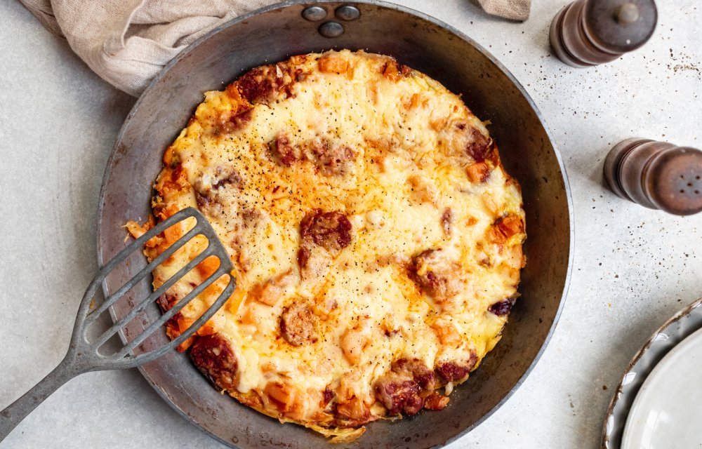 Zoete aardappeltortilla met rode ui en vegan chorizo